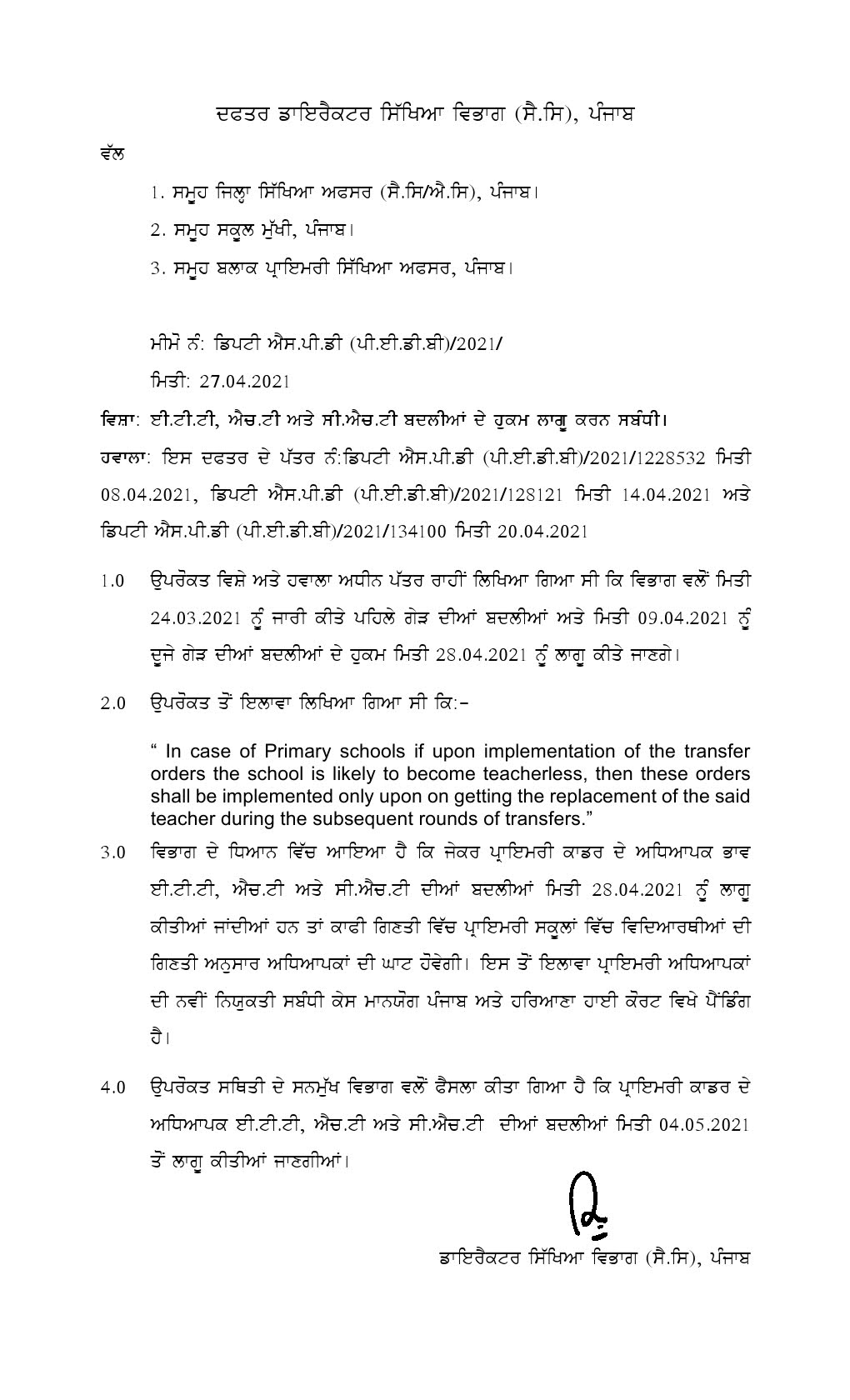 Regarding implementation of transfer orders of ETT/HT/CHT